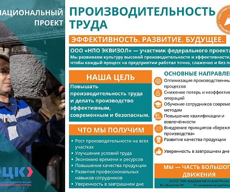 ООО «НПО «ЭКВИЗОЛ» присоединилось к федеральному проекту «Производительность труда», который реализуется в рамках национального проекта «Эффективная и конкурентная экономика».